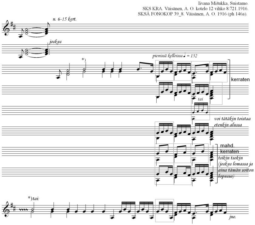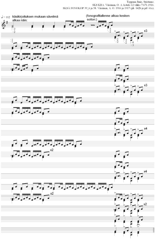 There are differences in the notation of the various arrangements of the tune. Väisänen described the challenges of his own manuscript as follows: “Since there was no opportunity to notate the tunes (in Helsinki) at the same time as they were parlographed, and since no accompaniment notes can be heard from the cylinder, the tunes are therefore incomplete”² (Väisänen (1928) 2002, xl).