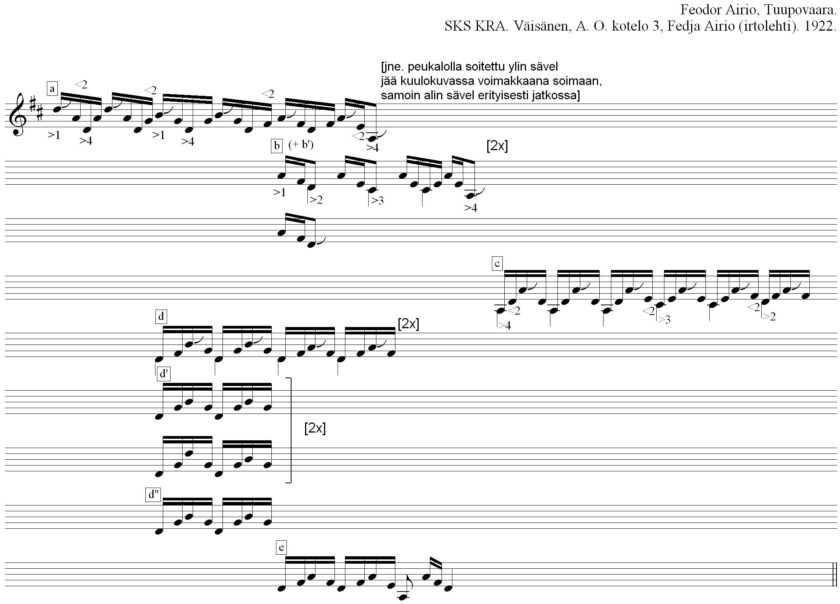According to Tuomo Airio, the son of Feodor Airio, playing church‑bell melodies may have been a kind of confession of faith. He also noted that his father improvised his own music and varied the melody while playing—something that the musical notation in question does not indicate (unpublished interview material: telephone interview with Tuomo Airio, 17 December 2023).