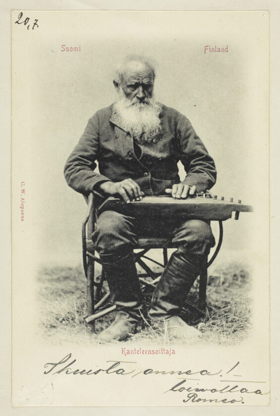 Everik Rähkönen. Photo: Ludvig Fabritius, 1897. Sibelius Museum, finna.fi. In this picture, instead of the traditional carved kantele, Rähkönen plays a kantele made of several pieces with metal tuning pegs. This instrument represents the change in musical culture.