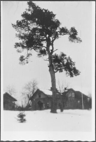A sacred tree that served as a boundary marker for farms. According to an old belief, the tree always drops its branches from the side of the house from which the next deceased person comes. Kuljakko, Ruskeala, Border Karelia, 1930s. The Finnish Heritage Agency, Historical Picture Collection, finna.fi.