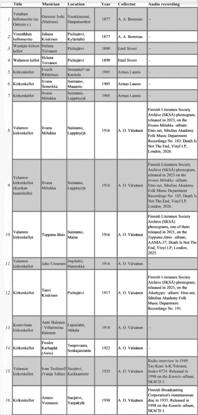 Table 1. Kantele recordings from around the turn of the 20th century imitating church bells (Finnish Literature Society Archives).