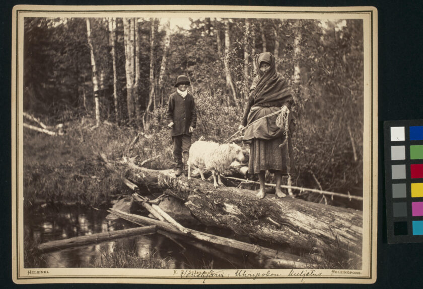 A woman and boy carry a ram for sacrifice, Venehjärvi, Viena Karelia. Photo: I. K. Inha, 1894. Finnish Literature Society, finna.fi.